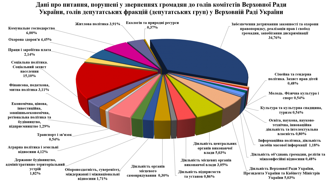 У пропозиціях, заявах і скаргах громадян, поданих під час особистих прийомів голів комітетів Верховної Ради України, голів депутатських фракцій (депутатських груп) у Верховній Раді України протягом роботи другої сесії Верховної Ради України дев’ятого скликання, збільшилася кількість питань щодо діяльності центральних органів виконавчої влади – 94, або 5 відсотків загальної кількості питань; відгуків щодо діяльності Верховної Ради України, Президента України та Кабінету Міністрів України – 94, або 5 відсотків; охорони здоров’я – 83, або 4,4 відсотка; аграрної політики і земельних відносин – 77, або 4,1 відсотка; фінансової, податкової та митної політики – 58, або 3,1 відсотка; діяльності місцевих органів виконавчої влади – 57, або 3 відсотки.