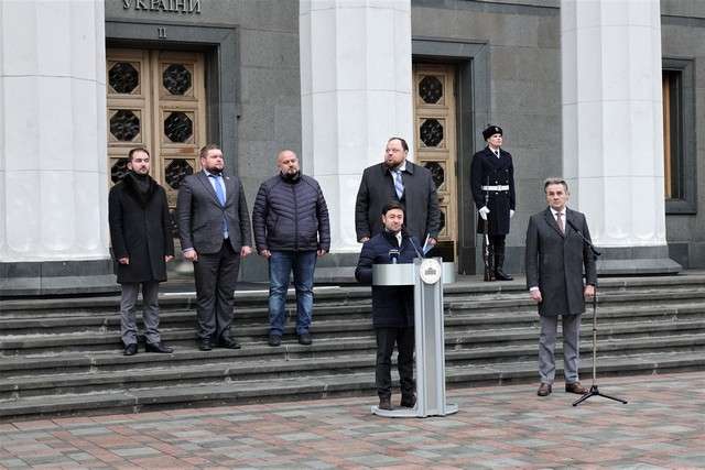 Військовослужбовці Почесної варти під Державний Гімн України у виконанні оркестру підняли Державний прапор України біля центрального входу будинку Верховної Ради.