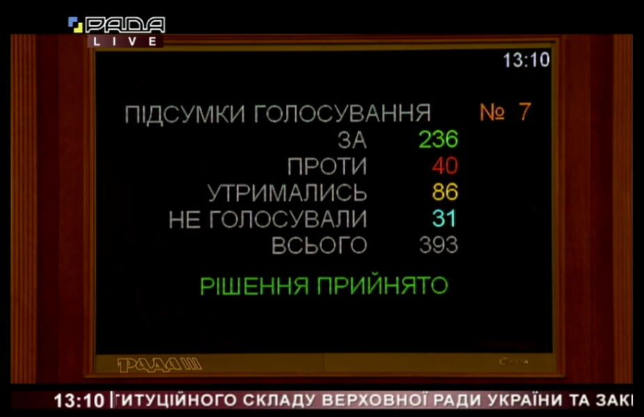 Верховна Рада 236 голосами «за» прийняла Постанову «Про попереднє схвалення законопроекту про внесення змін до статей 76 та 77 Конституції України (щодо зменшення конституційного складу Верховної Ради України та закріплення пропорційної виборчої системи) №1017.