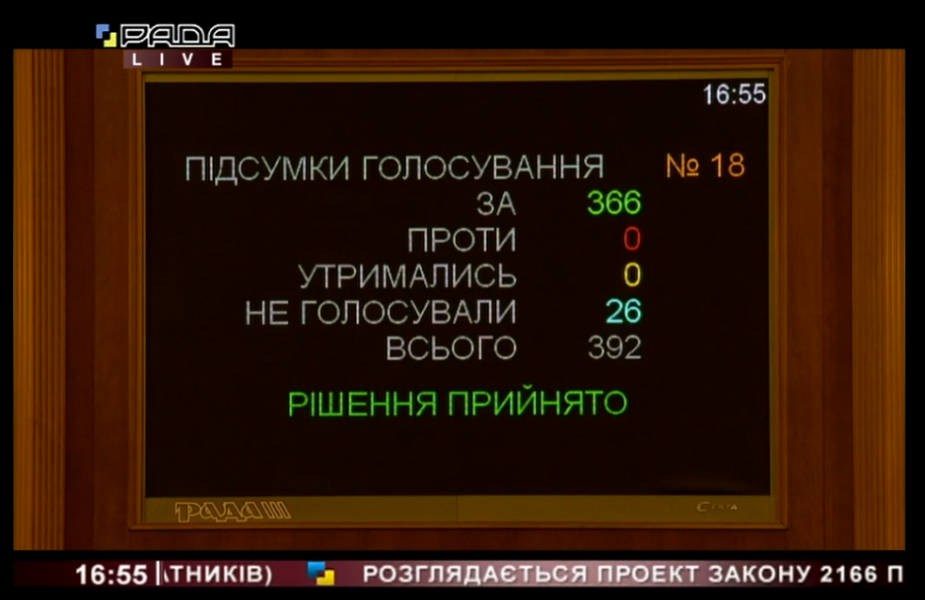 За результатами голосування законопроект №2166 прийнято за основу 366 голосами «за».