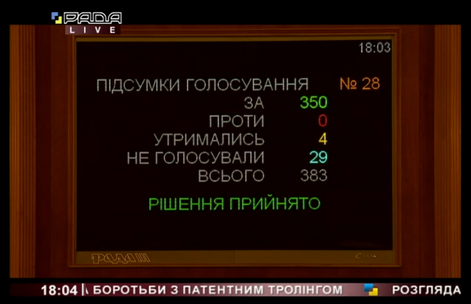 Після короткого обговорення законопроект було прийнято за основу 350 голосами.