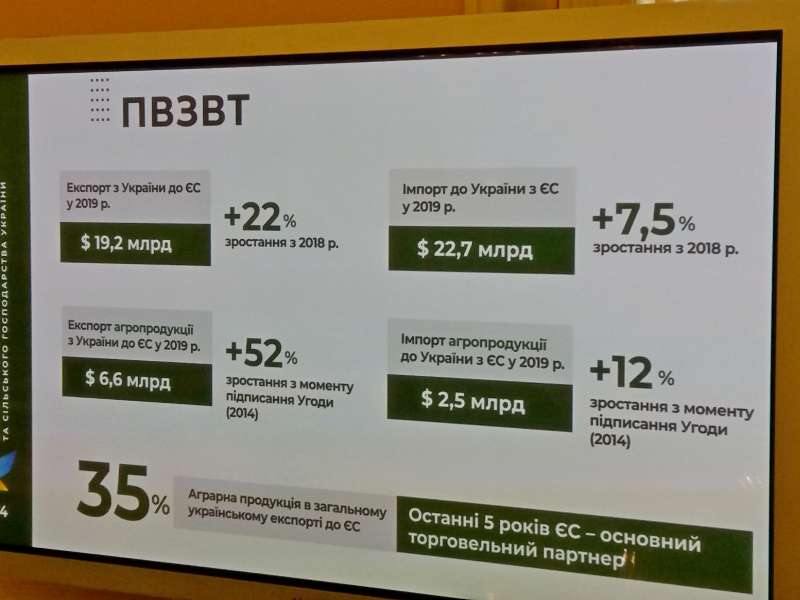 «З моменту підписання угоди, у 2014 році, експорт агропродукції з України до ЄС у 2019 році збільшився на 52% - з 4,3 у 2014 році до 6,6 мільярда доларів за 11 місяців 2019 року (офіційні дані за рік будуть оприлюднені завтра). При цьому 35% всього аграрного експорту країни йде до ЄС. Домінують в експорті, традиційно: зернові, олійні культури і олія», - поінформував урядовець.