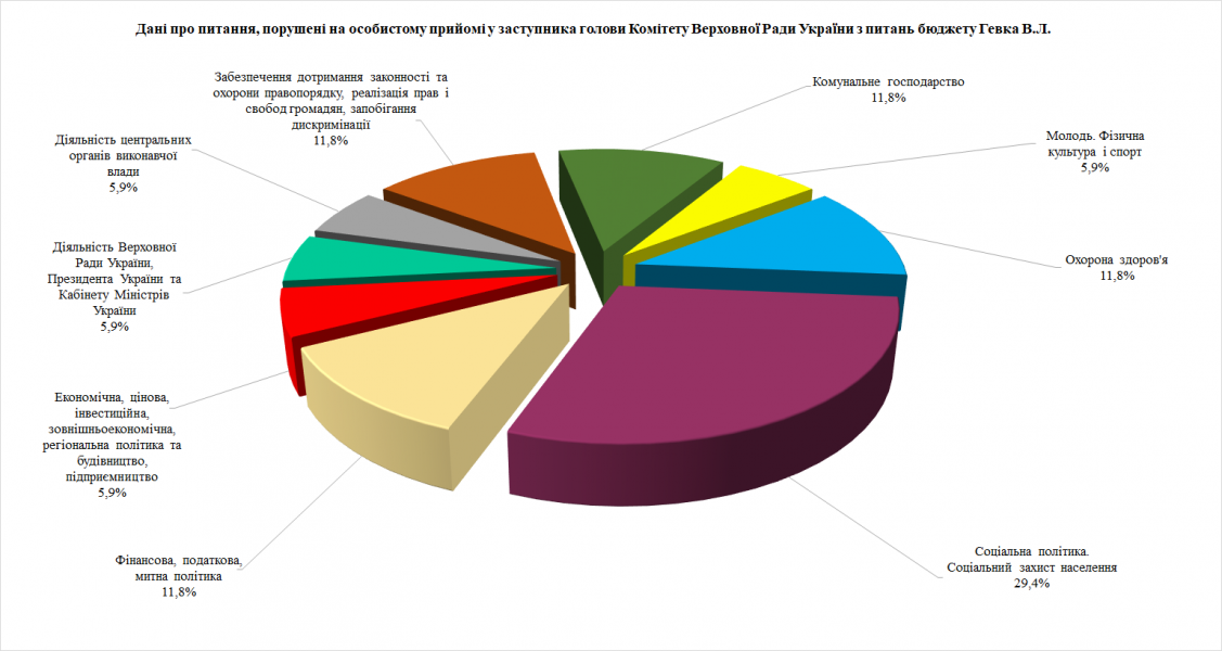 Під час особистого прийому відвідувачі порушили 17 питань, серед яких: соціальної політики та соціального захисту населення; фінансової, податкової, митної політики; забезпечення дотримання законності та охорони правопорядку, реалізації прав і свобод громадян, запобігання дискримінації; охорони здоров’я; комунального господарства.
