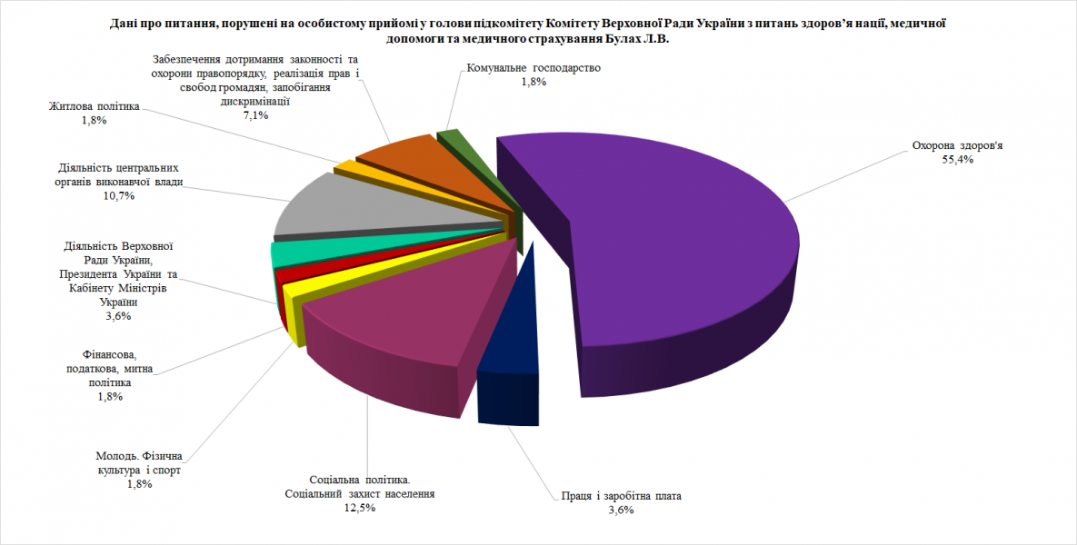 Під час особистого прийому відвідувачі порушили 56 питань, серед яких: охорони здоров’я; соціальної політики та соціального захисту населення; діяльності центральних органів виконавчої влади; забезпечення дотримання законності та охорони правопорядку, реалізації прав і свобод громадян, запобігання дискримінації.