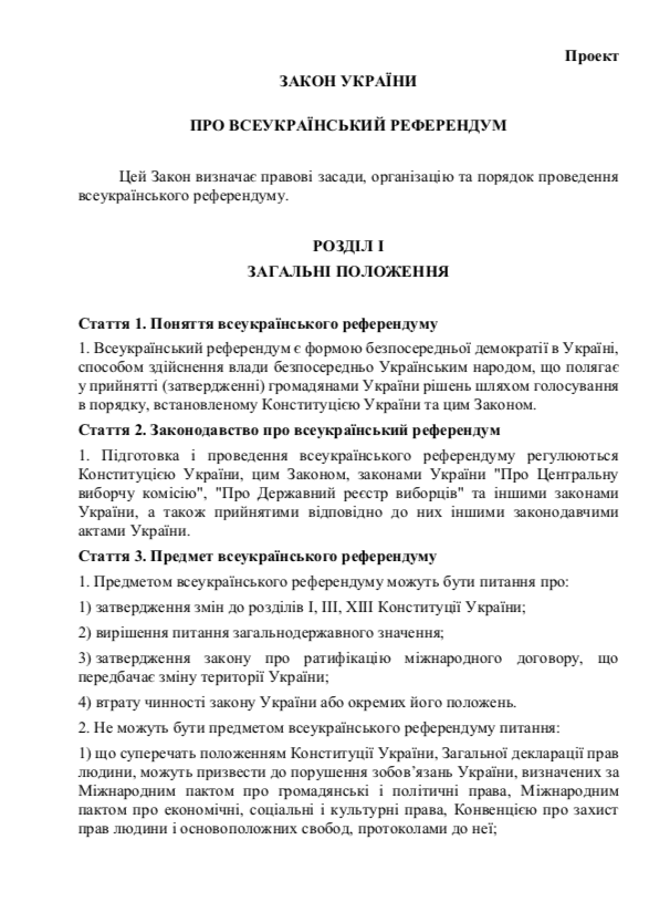 Пропозиції та зауваження до законопроекту приймаються в електронному вигляді на електронну адресу: nationalreferendum@ukr.net.