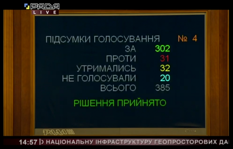Верховна Рада прийняла 302 голосами «за» у другому читанні та в цілому проект Закону про національну інфраструктуру геопросторових даних №2370.