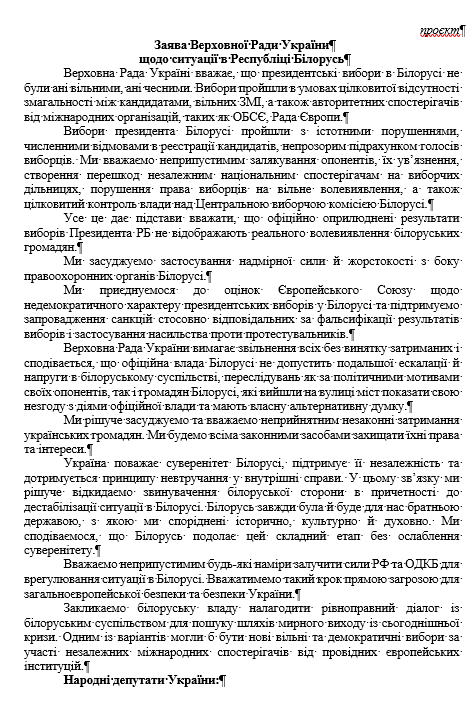 Верховна Рада України також засудила застосування надмірної сили й жорстокості з боку правоохоронних органів Білорусі.