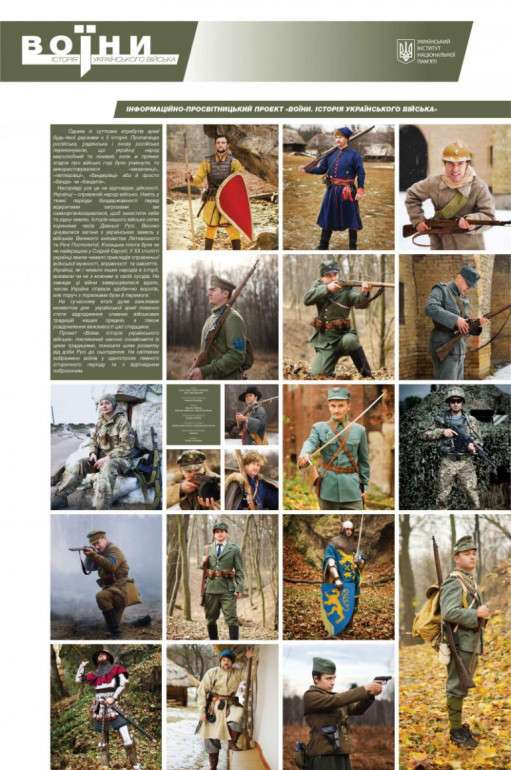 Виставка «Воїни. Історія українського війська» – це 20 розповідей про історію військових формувань на теренах України від часів Русі до сьогодення. Експозиція дає змогу зазирнути в минуле та подивитися, якими були однострої та зброя українських воїнів у різні історичні епохи. Світлини супроводжує інформація про тип військових організацій, чисельність і озброєння військ, методи воєнного мистецтва та найвизначніші битви. https://uinp.gov.ua/vystavkovi-proekty/vystavka-voyiny-istoriya-ukrayinskogo-viyska