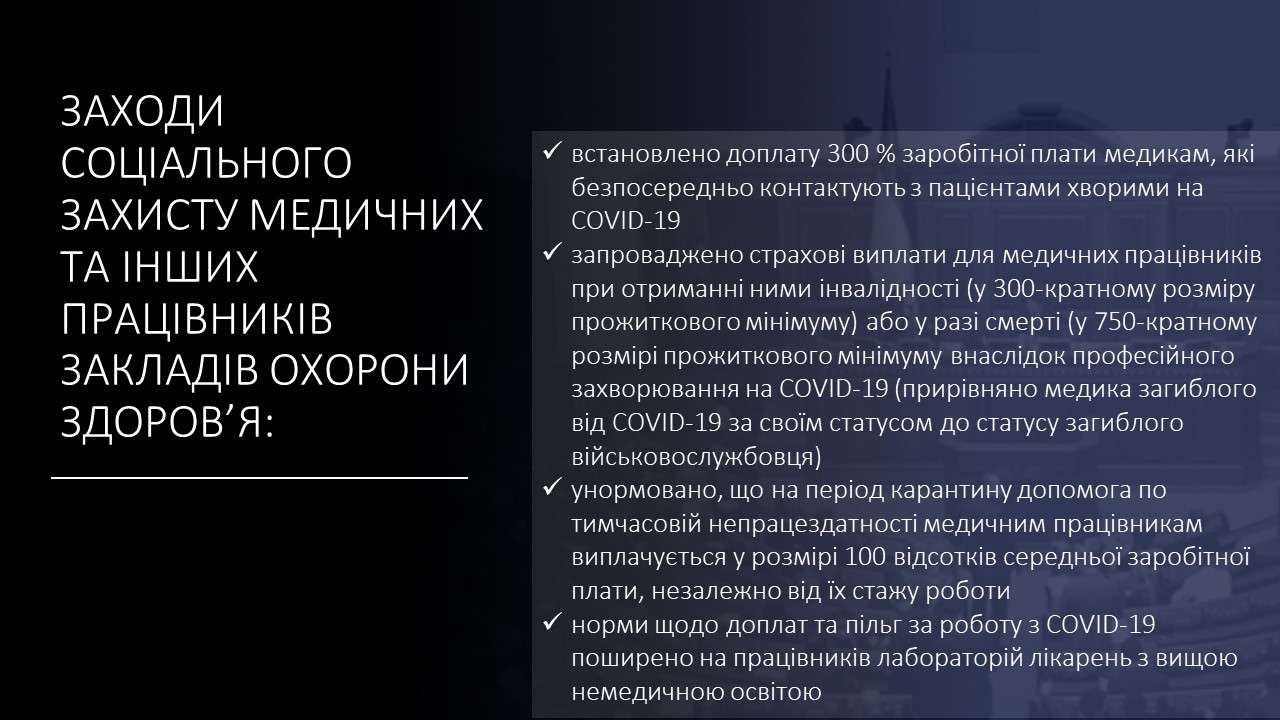 «Зокрема, встановлена доплата 300?% зарплати медикам, які контактують із хворими на COVID-19. Запроваджено страхові виплати для медпрацівників у разі смерті (у 750-кратному розмірі прожиткового мінімуму внаслідок професійного захворювання на COVID-19). Медика, загиблого від СOVID-19, за статусом прирівняно до статусу загиблого військовослужбовця», - деталізував Руслан Стефанчук.