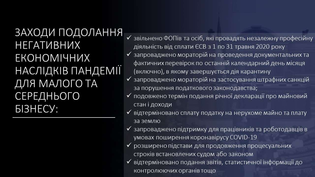 «Прийняли рішення щодо виплати допомоги ФОПам і працівникам підприємств, що не працювали під час карантину, у розмірі 8000 грн. А також до травня 2021 року звільнили ФОПів 1 групи від сплати ЄСВ та, у співпраці з Урядом, визначили цілу низку інших економічних стимуляторів», - роз’яснив Руслан Стефанчук.