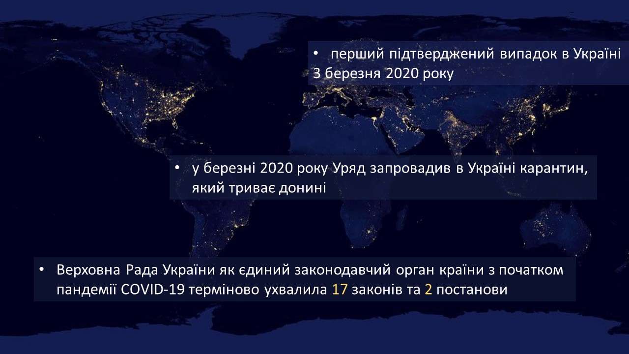 «Перший – це запобігання поширенню коронавірусу. Парламентом України було запроваджено обов’язкове тестування осіб з ознаками COVID-19, визначено умови в’їзду в Україну та виїзду громадян із зони карантину, надано можливість працювати дистанційно, створено умови для розвитку виробництва дезінфекційних та антисептичних лікарських засобів, введено штрафні санкції за порушення правил карантину та інші», - розповів Перший заступник Голови Верховної Ради України.