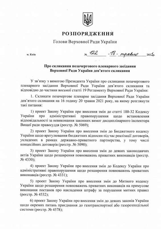 1. Скликати позачергове пленарне засідання Верховної Ради України дев’ятого скликання на 16 годину 20 травня 2021 року, на якому розглянути такі питання: