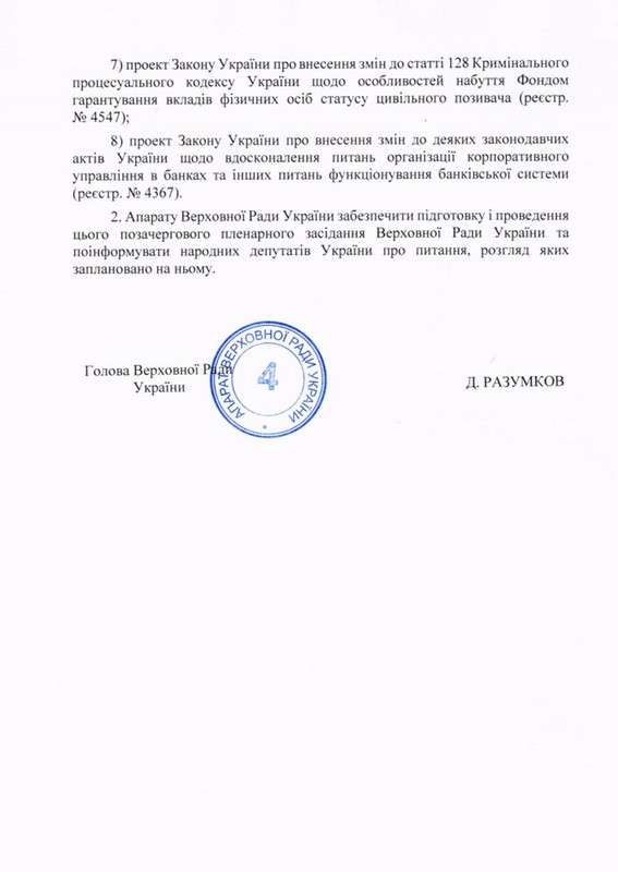 У зв’язку з вимогою Президента України про скликання позачергового пленарного засідання Верховної Ради України дев’ятого скликання та відповідно до частини восьмої статті 19 Регламенту Верховної Ради України: