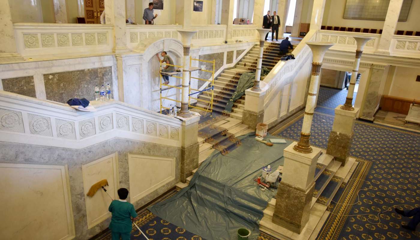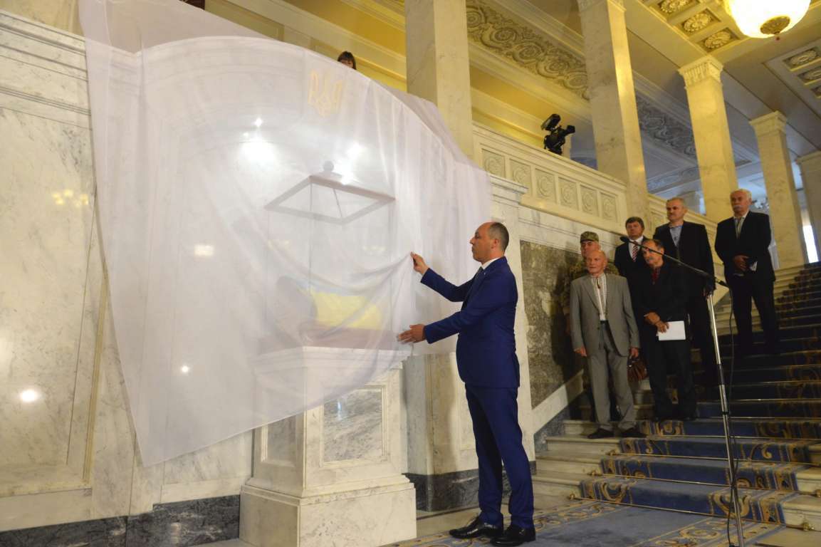 24 серпня група депутатів, серед яких були Вячеслав Чорновіл, Микола Поровський, Іван Заєць, Ярослав Кендзьор, Ігор Деркач, Володимир Крижанівський, внесла до сесійної зали прапор, розміром 8х4 метри, і накрила ним трибуну. Цей момент за ініціативою Голови Верховної Ради Івана Плюща закарбував художник Олексій Кулаков на картині «Державотворення».