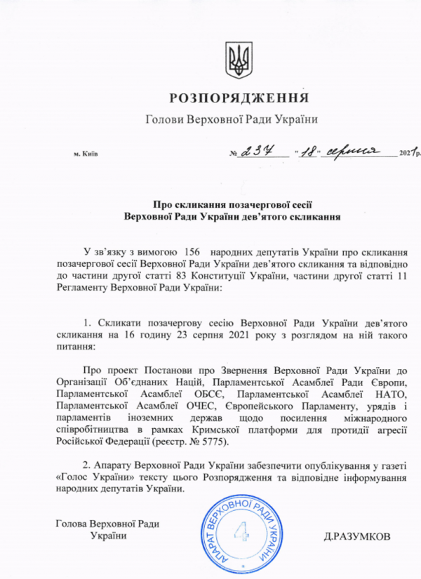 1. Скликати позачергову сесію Верховної Ради України дев’ятого скликання на 16 годину 23 серпня 2021 року з розглядом на ній такого питання: