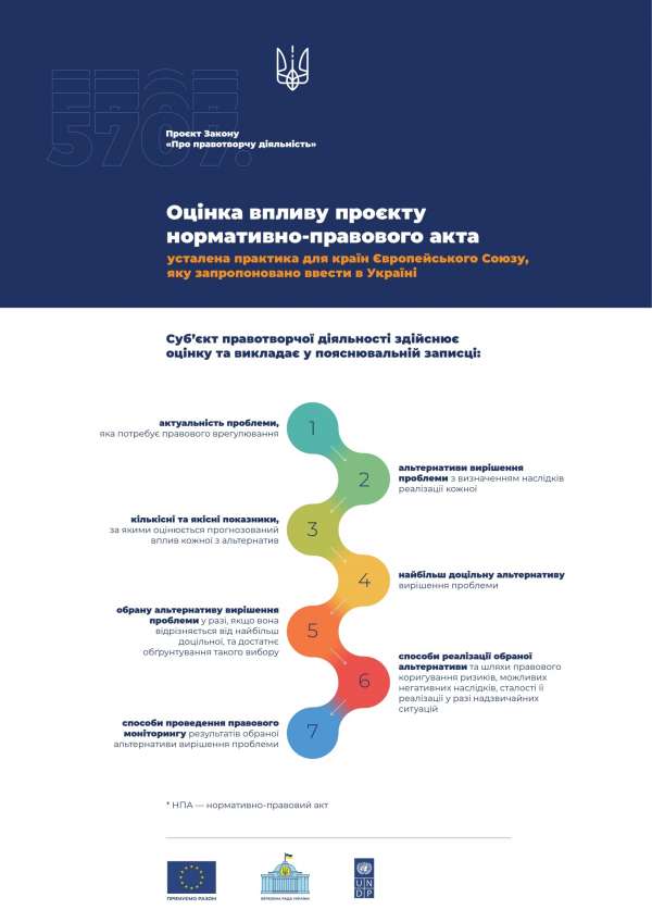 «Проєктом закону №5707 «Про правотворчу діяльність» запропоновано ввести практику оцінки впливу проєктів нормативно-правових актів (НПА), яка вже є поширеною в багатьох країнах сталої демократії, а в більшості країн Європейського Союзу застосовується для всіх типів проєктів НПА. Щоби законодавчий процес в Україні став ефективним і злагодженим, значна увага повинна приділятись якісній аналітичній роботі ще до початку розробки проєктів НПА. Одним з інструментів втілення такої роботи є оцінка впливу проєктів НПА», — наголосив Руслан Стефанчук.
