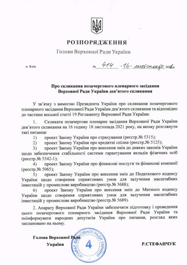 1. Скликати позачергове пленарне засідання Верховної Ради України дев’ятого скликання на 16 годину 18 листопада 2021 року, на якому розглянути такі питання: