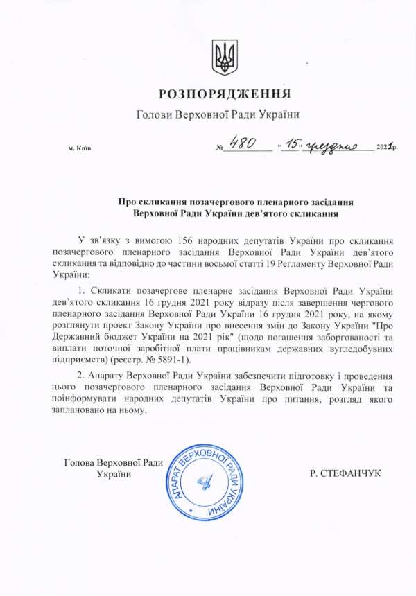 1. Скликати позачергове пленарне засідання Верховної Ради України дев’ятого скликання 16 грудня 2021 року відразу після завершення чергового пленарного засідання Верховної Ради України 16 грудня 2021 року, на якому розглянути проект Закону України про внесення змін до Закону України "Про Державний бюджет України на 2021 рік" (щодо погашення заборгованості та виплати поточної заробітної плати працівникам державних вугледобувних підприємств) (реєстр. № 5891-1).