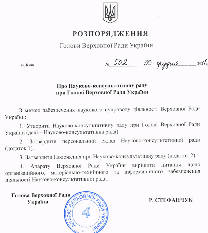 Голова Верховної Ради України Руслан Стефанчук підписав Розпорядження №502 про Науково-консультативну раду при Голові Верховної Ради України