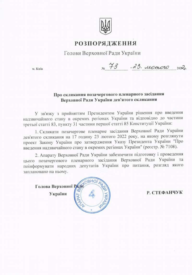1. Скликати позачергове пленарне засідання Верховної Ради України дев'ятого скликання на 17 годину 23 лютого 2022 року, на якому розглянути проект Закону України про затвердження Указу Президента України "Про введення надзвичайного стану в окремих регіонах України" (реєстр. № 7108).