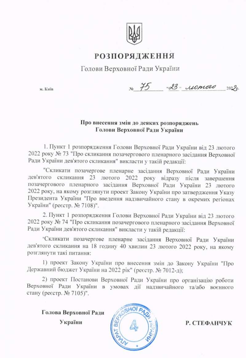 "Скликати позачергове пленарне засідання Верховної Ради України дев'ятого скликання 23 лютого 2022 року відразу після завершення позачергового пленарного засідання Верховної Ради України 23 лютого 2022 року, на якому розглянути проект Закону України про затвердження Указу Президента України "Про введення надзвичайного стану в окремих регіонах України" (реєстр. № 7108)".