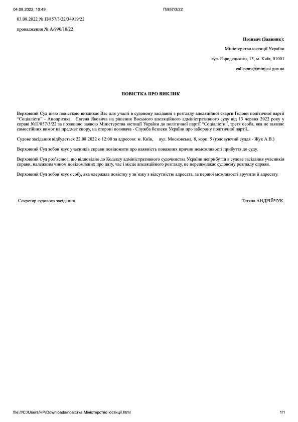 Повідомляємо, що судове засідання з розгляду апеляційної скарги Голови політичної партії «Соціалісти» Анопрієнка Євгена Яковича на рішення Восьмого апеляційного адміністративного суду від 13.06.2022 у справі No П/857/3/22 за позовом Міністерства юстиції до політичної партії «Соціалісти», третя особа, яка не заявляє самостійних вимог щодо предмета спору на стороні позивача – Служба безпеки України, про заборону діяльності політичної партії, відбудеться 22.08.2022 о 12:00 за адресою: м. Київ,вул.Московська, 8, корп. 5.