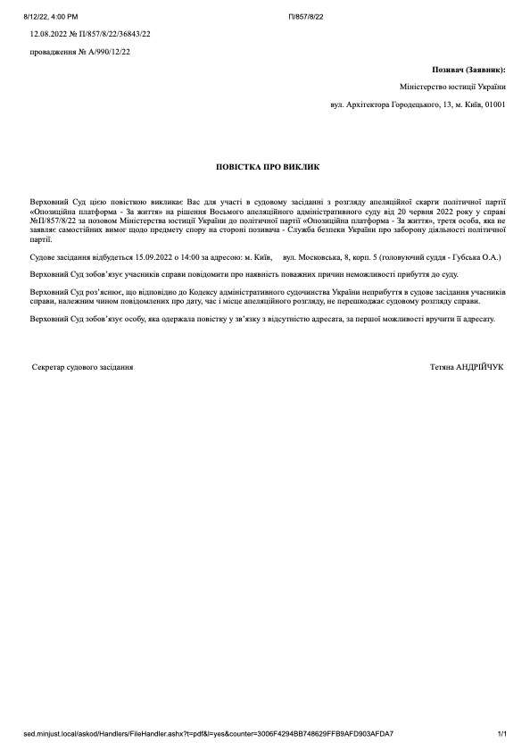 Повідомляємо, що судове засідання з розгляду апеляційної скарги політичної партії «Опозиційна платформа – За життя» на рішення Восьмого апеляційного адміністративного суду від 20.06.2022 у справі No П/857/8/22 за позовом Міністерства юстиції до політичної партії «Опозиційна платформа – За життя», третя особа, яка не заявляє самостійних вимог щодо предмета спору на стороні позивача – Служба безпеки України, про заборону діяльності партії, відбудеться 15.09.2022 о 14:00 за адресою: м. Київ, вул. Московська, 8, корп. 5.