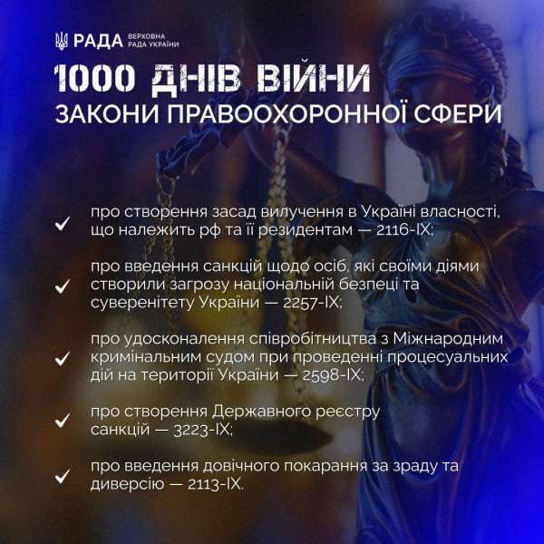 Окремі Закони визначають засади примусового вилучення в Україні об'єктів права власності, що належать рф та її резидентам (2116-IX), передбачають санкції щодо фізичних або юридичних осіб, які своїми діями створили загрозу національній безпеці та суверенітету (№ 2257- IX), та удосконалюють співробітництво з Міжнародним кримінальним судом при проведенні процесуальних дій на території України (№ 2598-ІХ).