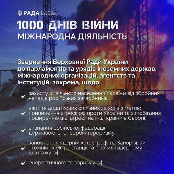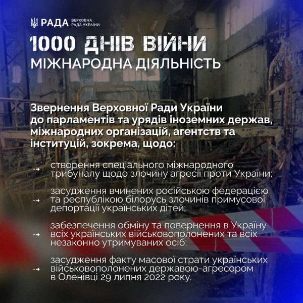 З метою об’єднання міжнародної спільноти для допомоги Україні Верховна Рада України ухвалила численні звернення до парламентів та урядів іноземних держав, міжнародних організацій та інституцій із закликами щодо підтримки нашої держави, посилення її обороноздатності, засудження та введення санкцій проти країни-агресора.