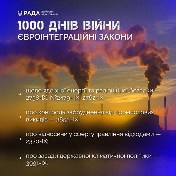 Важливими є євроінтеграційні закони щодо ядерної енергії та радіаційної безпеки (2758-IX, №2479- IX, 2762-IX), про контроль забруднення від промислових викидів (3855–ІХ), відносини у сфері управління відходами (2320-IX) та про засади державної кліматичної політики (3991-IX).