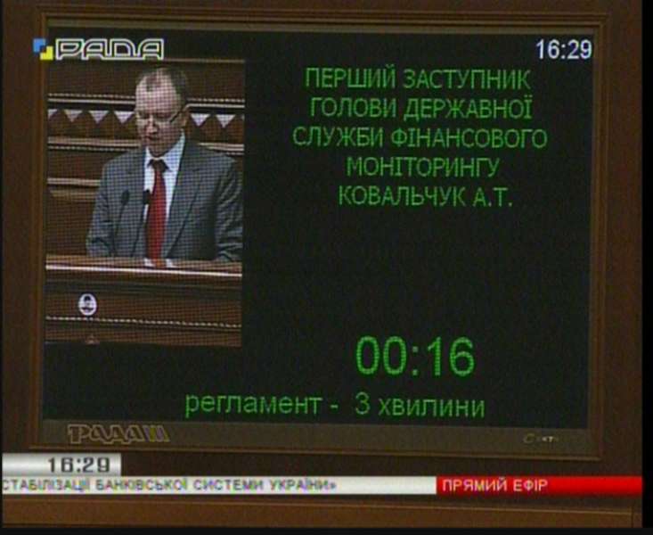 Представник Державної служби фінансового моніторингу для розв'язання проблеми, яка обговорюється на цих слуханнях, запропонував внести невідкладні зміни в Закон "Про Національний банк України" в частині приведення публічно-правового статусу НБУ до існуючої практики саме тих країн, яким вдалося уникнути системної кризи 2008 року. Без цього, на його думку, неможливо оздоровити не лише грошово-кредитну політику, а й всю фінансову систему України.