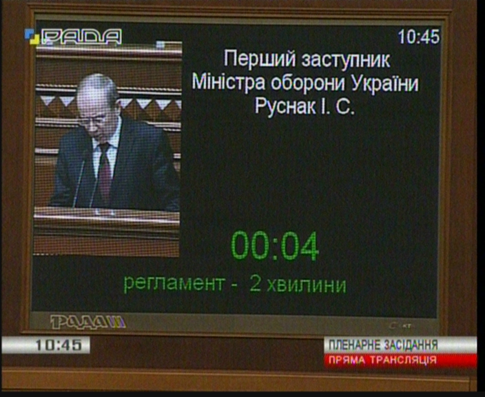 Проект закону про внесення зміни до статті 9 Закону "Про оборону України" (щодо військовополонених й інтернованих в особливий період) за реєстр. №1535 доповів перший заступник Міністра оборони Іван Руснак. Він зазначив, що проект розроблено з метою впорядкування питань щодо збору, охорони та забезпечення тримання військовополонених і інтернованих в особливий період. За словами доповідача, на цей час на законодавчому рівні порядок поводження з військовополоненими та інтернованими невизначений, повноваження щодо їх охорони та утримання на жоден центральний орган виконавчої влади не покладено.