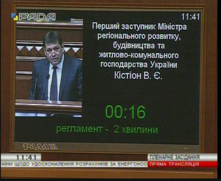 Проект закону про внесення змін до деяких законів України щодо удосконалення розрахунків за енергоносії, а також для погашення позик, отриманих від міжнародних фінансових організацій (реєстр. №1538) доповів перший заступник Міністра регіонального розвитку, будівництва та житлово-комунального господарства Володимир Кістіон. Він зазначив, що проект розроблений Міністерством з метою стабілізації фінансово-господарського стану підприємств тепловодопостачання та водовідведення, який на даний час є досить критичним.