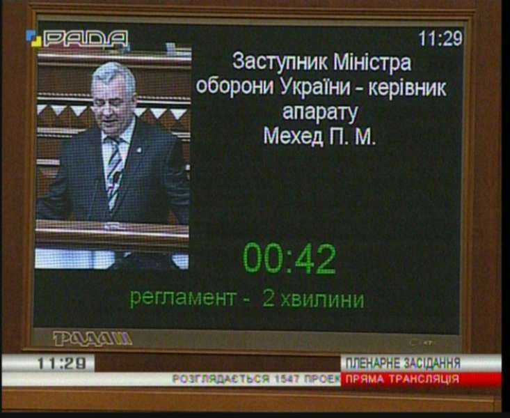 Проект закону про внесення змін до Закону України "Про організацію оборонного планування" (реєстр. №1547) у новій редакції доповів заступник Міністра оборони Петро Мехед. Він зазначив, що метою проекту є вдосконалення наявної системи оборонного планування у Збройних Силах України та інших військових формуваннях.
