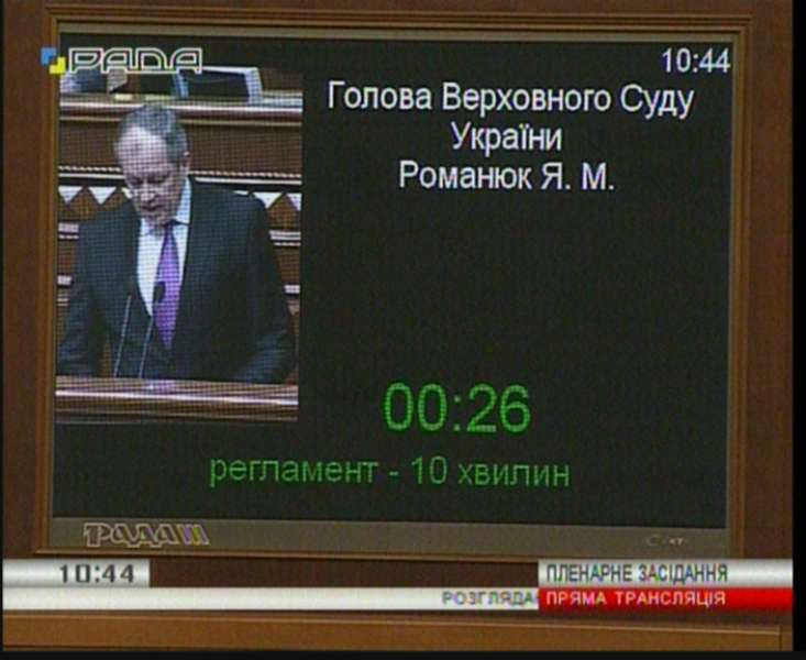 Проекти постанов про надання згоди на затримання та арешт (взяття під варту) окремих суддів доповів Голова Верховного Суду України Ярослав Романюк. Він зазначив, що Верховний Суд України підтримав подання Генеральної прокуратури України про надання згоди Верховної Ради України на затримання та обрання запобіжного заходу у вигляді арешту для суддів Печерського райсуду Києва Віктора Кицюка, Оксани Царевич, Сергія Вовка.