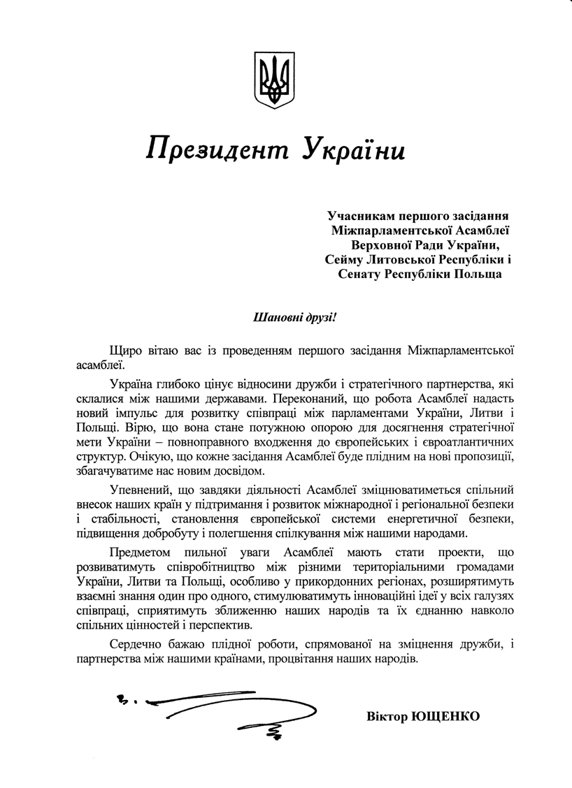 Президент України привітав учасників першого засідання Міжпарламентської Асамблеї Верхової Ради України, Сейму Литовської Республіки та Сейму і Сенату Республіки Польща, яке відбулось 16 червня 2008 року у Києві: