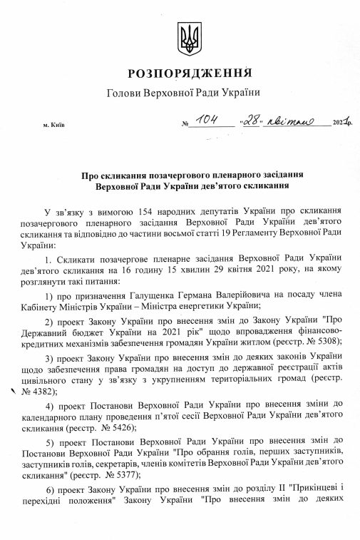 Голова Верховної Ради України Дмитро Разумков підписав Розпорядження №104 про скликання позачергового пленарного засідання Верховної Ради України дев’ятого скликання.