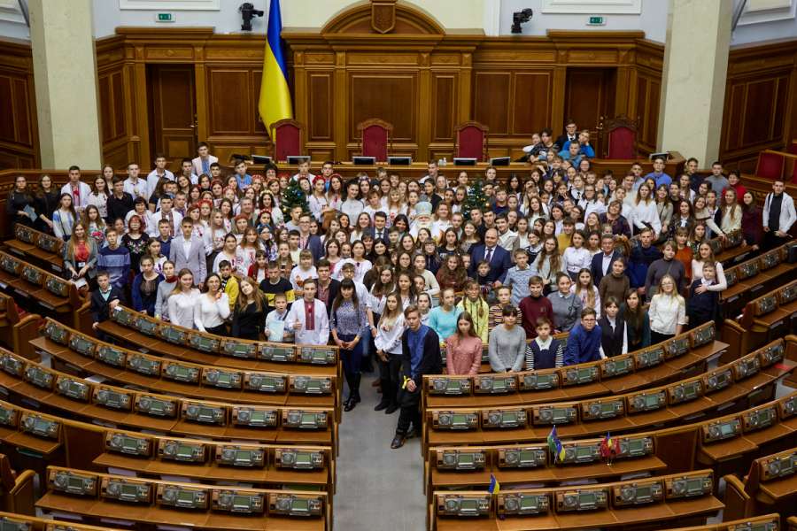 Голова Парламенту поспілкувався з дітьми та запропонував проголосувати за регламент святкового зібрання. Діти дружно підтримали пропозицію і спробували себе у ролі народних депутатів. Вони проголосували «за мир і щасливе майбутнє України».