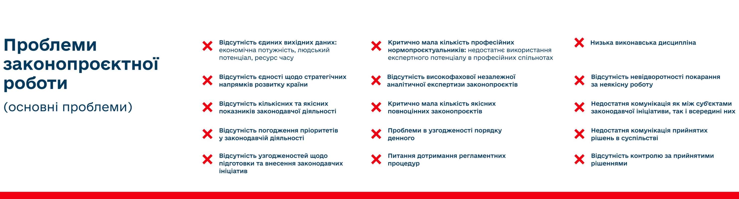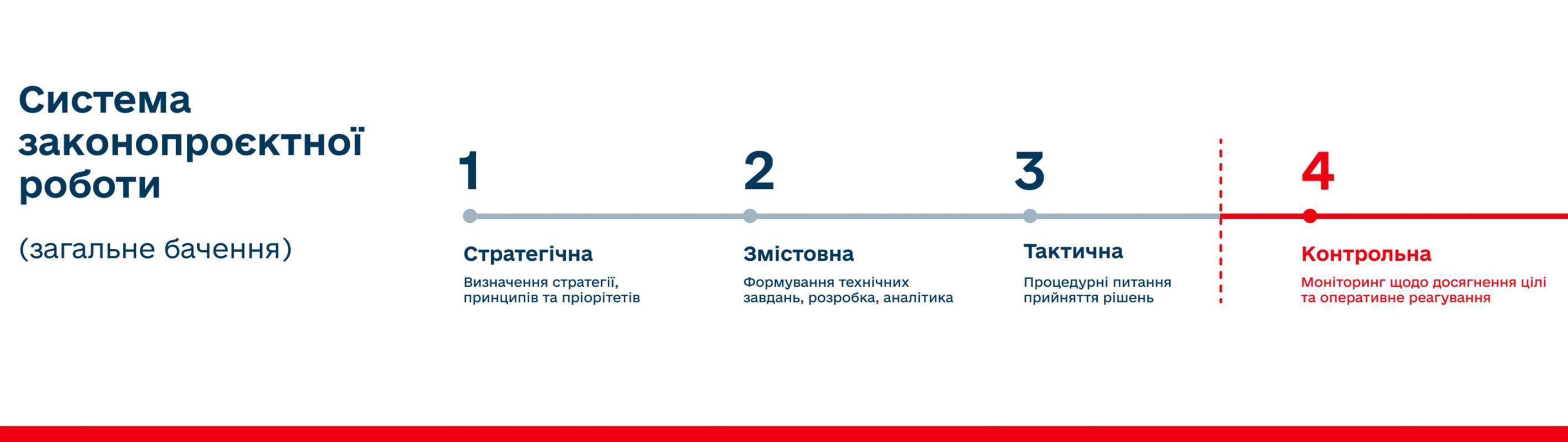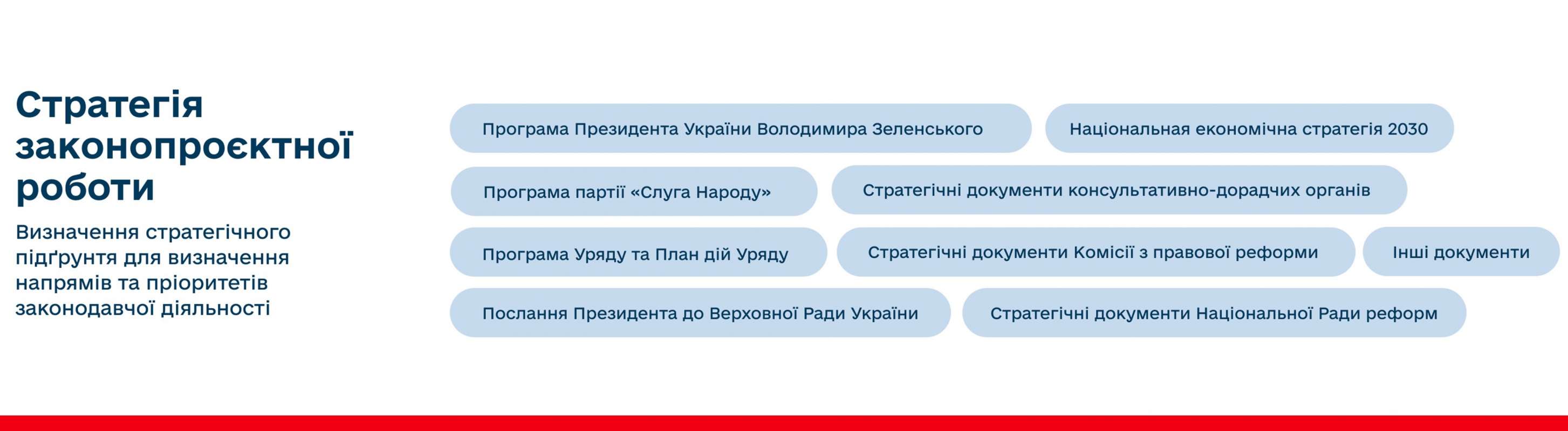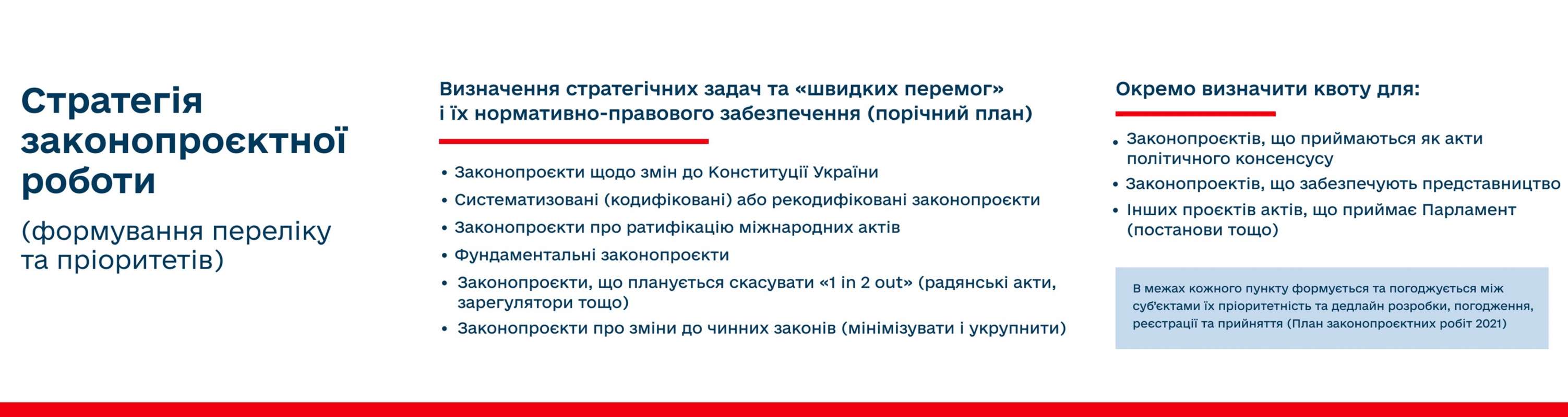 Із затвердженням «Національної економічної стратегії до 2030 року» можна сформувати перелік пріоритетів і в законотворчій роботі. Насамперед, це законопроєкти щодо змін до Конституції України та фундаментальні законопроєкти. Далі — систематизовані (кодифіковані) або рекодифіковані законопроєкти, законопроєкти про ратифікацію міжнародних актів, законопроєкти, що планується скасувати, зокрема, за принципом «1 in 2 out» (радянські акти, законодавчі зарегулятори тощо); законопроєкти про зміни до чинних законів, кількість яких необхідно мінімізувати й укрупнити.