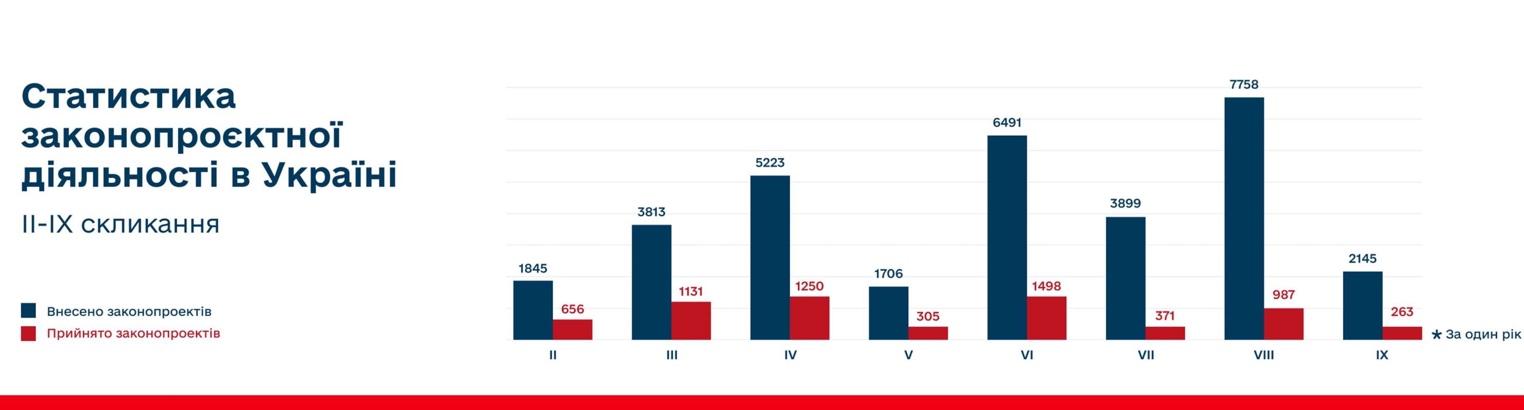 «Пропоную розглянути статистику законодавчої роботи в Україні за останні 7 скликань… Коефіцієнт корисної дії нормопроєктування в Україні, на превеликий жаль, — це просто те, що в усьому світі називають «законодавчим спамом» або «законодавчим цунамі». Йдеться про велику кількість внесених законопроєктів, які дублюються. Це конкуренція між суб’єктами законодавчої ініціативи за кількісні, а не якісні показники внесення відповідних рішень. Це війна між першим і другим читанням. Ми називаємо це «війною поправок», коли вносяться поправки тільки або заради поправок, або задля затягування часу», — зазначив Руслан Стефанчук.
