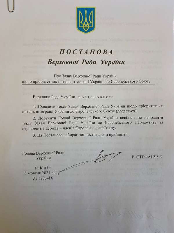 Голова Парламенту Руслан Стефанчук підписав Постанову Верховної Ради України «Про Заяву Верховної Ради України щодо пріоритетних питань інтеграції України до Європейського Союзу» (проект №6132).