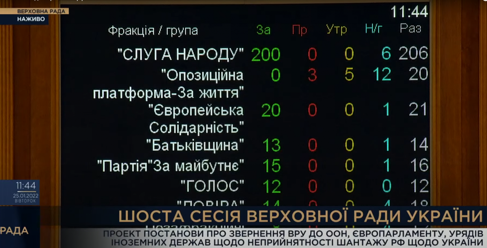 Верховна Рада України ухвалила Постанову «Про Звернення Верховної Ради України до Організації Об’єднаних Націй, Європейського Парламенту, урядів та парламентів іноземних держав та парламентських асамблей міжнародних організацій стосовно неприйнятності військового шантажу відносно України з боку Російської Федерації, який вона здійснює з метою недопущення реалізації європейських та євроатлантичних прагнень України».