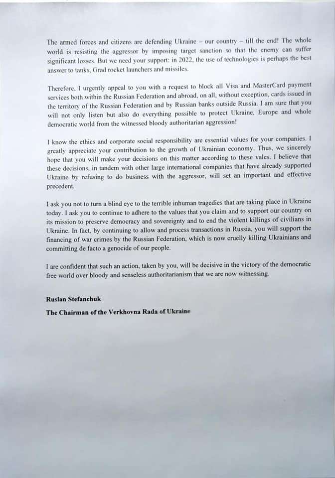 Голова Верховної Ради України Руслан Стефанчук звернувся до керівників компаній Visa і Mastercard із проханням заблокувати всі платежі Visa і Mastercard як на території РФ, так і за кордоном по всіх, без винятку, картках, випущених на території РФ та російськими банками за межами Росії.