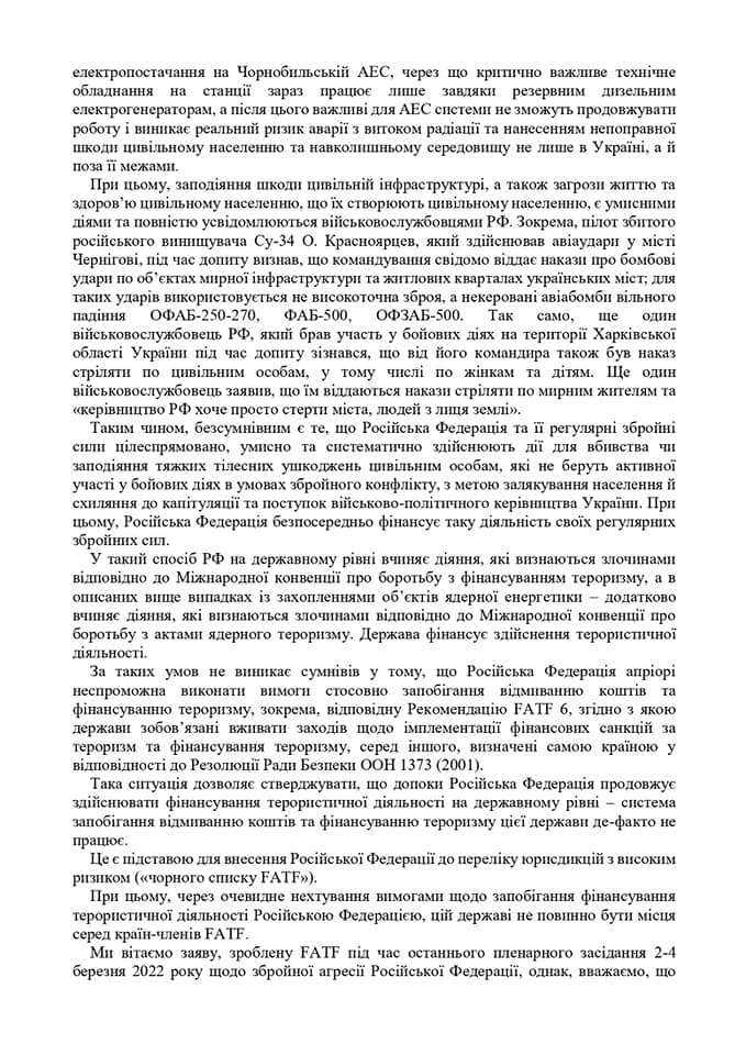 У зверненні наголошується, що допоки РФ продовжує здійснювати фінансування тероризму на державному рівні – система запобігання відмиванню коштів та фінансуванню тероризму цієї держави де-факто не працює.