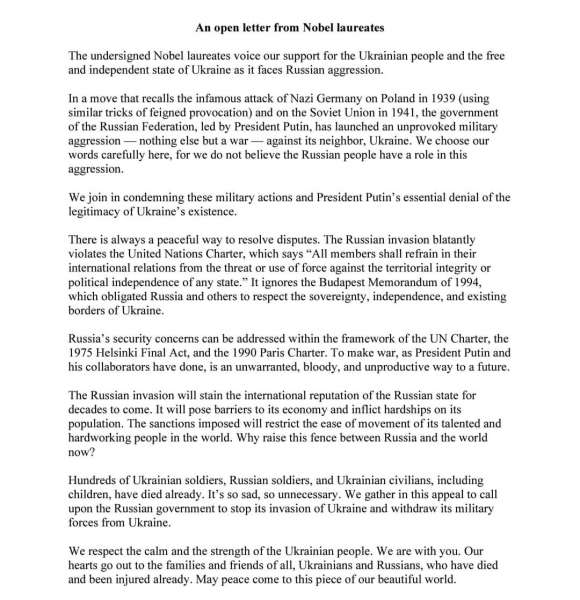 Нобелівські лауреати висловили свою підтримку українському народу та вільній незалежній державі Україна перед лицем російської агресії.