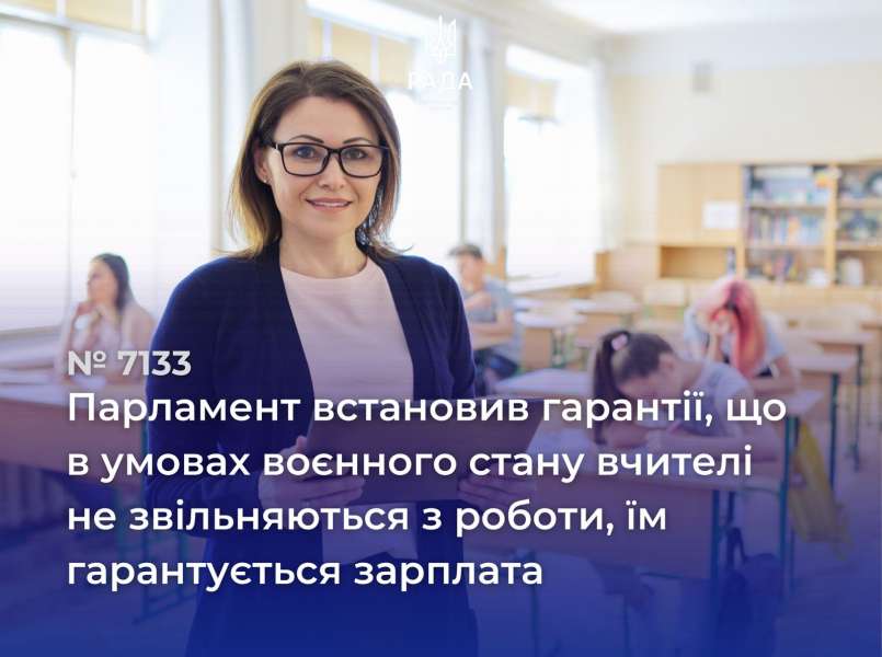 - закон 7133 — надали гарантії, що в умовах воєнного стану вчителі не звільняються з роботи, їм гарантується зарплата;