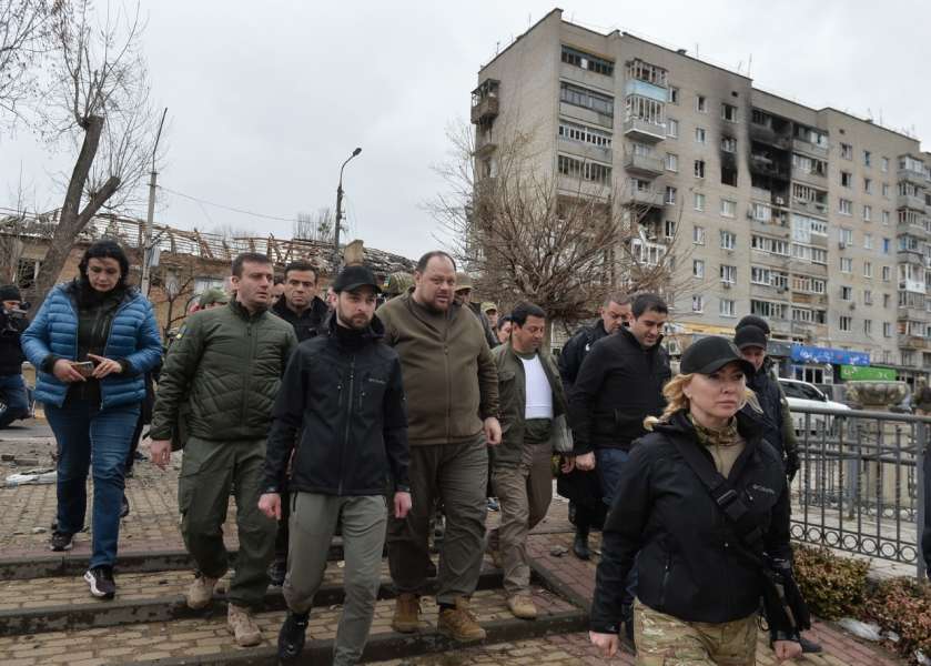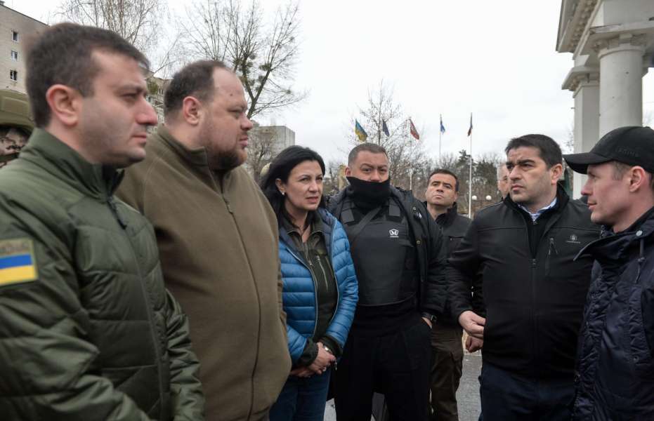 «За нами розташована будівля Будинку культури Ірпеня. Мабуть, це найголовніший військовий об’єкт, в який хотіли потрапити війська російської федерації. Сьогодні ми також мали можливість побачити інші місця влучень російської армії: ми були в Бучі, бачили місця масового заховання, бачили, як працюють кримінальні експерти. Важливо не лише почути, не лише побачити по телебаченню, а на власні очі переконатися, які звірства були на території нашої України», — наголосив Голова українського Парламенту.
