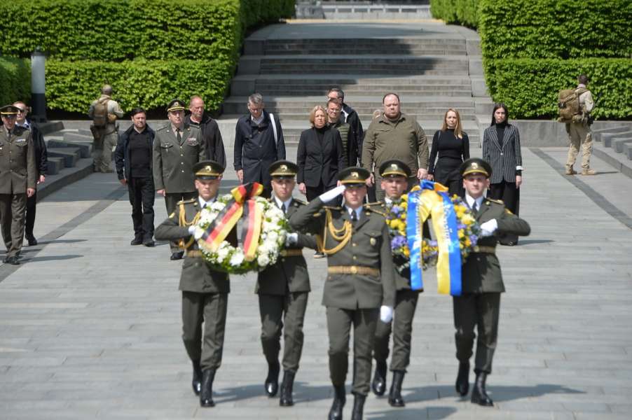 Спікери Парламентів України та Німеччини взяли участь у церемонії покладання квітів до могили Невідомого солдата та вшанували пам'ять загиблих хвилиною мовчання.