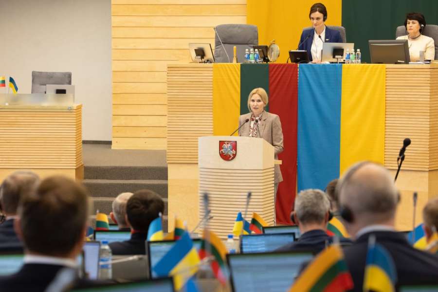 Насамперед Віцеспікерка Парламенту України висловила вдячність від імені Верховної Ради України та Українського народу за запрошення відвідати сестринську Литву та особливу честь звернутися до парламентаріїв саме українською мовою: «Хочу, щоби більше народів Європи та світу знали, чули й поважали українську мову, яка скоро стане однією з офіційних мов країн Євросоюзу». Вона також подякувала особисто Спікерці Парламенту Литовської Республіки Вікторії Чміліте-Нільсен за сміливий візит і чудовий виступ у Верховній Раді України 24 березня 2022 року, який був одним із перших на такому високому рівні після початку масштабного російського вторгнення.