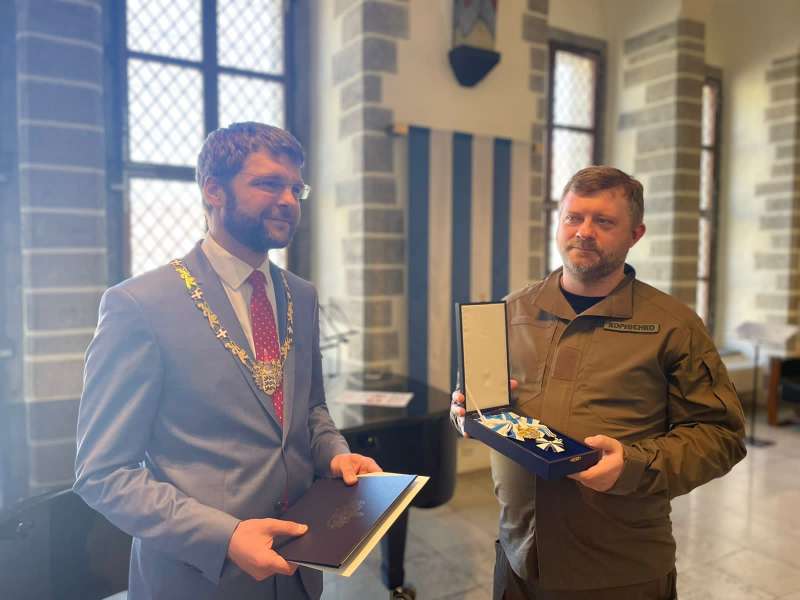 Перший заступник Голови Верховної Ради України Олександр Корнієнко отримав для Президента України Володимира Зеленського нагороду — Герб Таллінна — від Голови міської Ради Таллінна Євгена Осіновського.